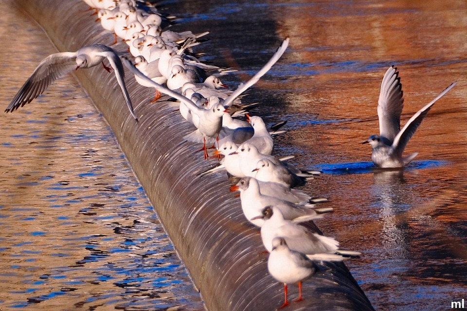 Les goélands dansent les plumes dans le vent, voltigent, plongent et croisent des poissons au loin de la plage.